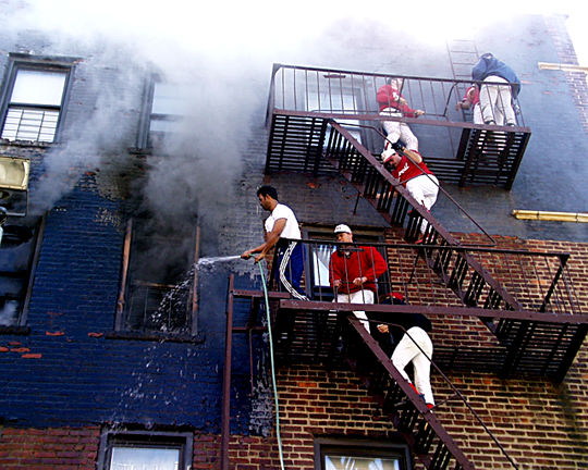 The FDNY Bravest baseball game went into over time today, when they were interrupted by an All Hands! Queens box 4503 at 137th Street and 32nd Ave. at 14:55hrs 4/10/99 The Mariner did a fine job with a garden hose while the Bravest searched and removed two victims. Photos by: Don Van Holt, Webmaster ( F.D.N.Y. HOME PAGE )