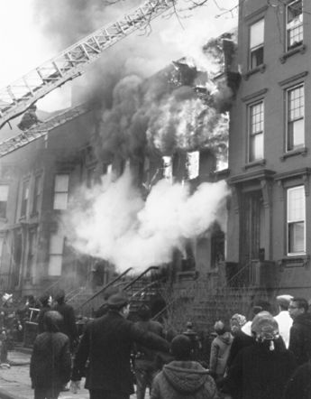 Mother escaped out the rear after making a futile attempt to find the 4th child who died. Engine Company 235 is stopped at the front stoop because the staircase has been burned away.