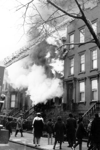 Mother escaped out the rear after making a futile attempt to find the 4th child who died. Engine Company 235 is stopped at the front stoop because the staircase has been burned away.