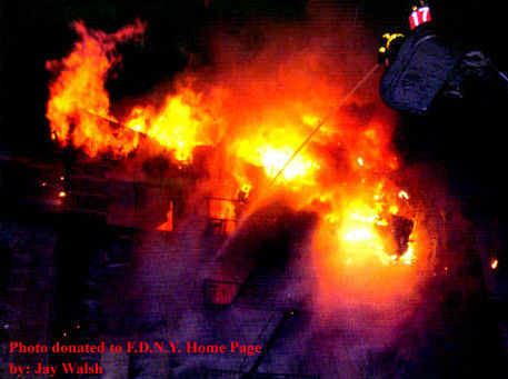 4th Alarm on 146 and Amsterdam, in the winter of 1988. Danny Sheridan and Tom MacDowell in the bucket!