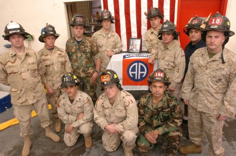 Enclosed is a picture of just a small group of guys who worked in E66/L61 the night of Chris Engeldrums funeral to allow the brothers from his firehouse the night off to attend the funeral at Arlington Natl. Cememtary. These guys are all vets of the war in Iraq as well as a vet from the first Gulf War (Marine and member of L22 Pat McElvaney {in greens}). This group was put together by John Gormely a Lt. from E84/L34. John is a fighter pilot, founder of the FDNY VFW Post (soon to be named in Chris' honor) and all around great guy.