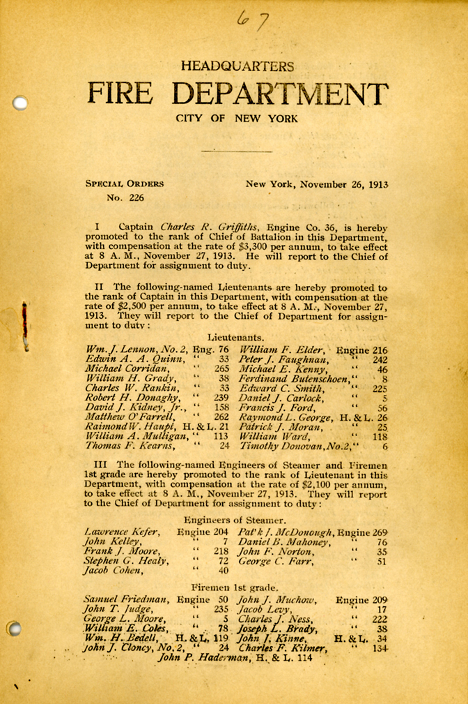 ENGINE 283 BROOKLYN ORG. 214 Bristol St. (Nov. 27, 1913) NQTRS. 885 Howard Ave. W/ SQ-4 (Nov. 19, 1973) listed are the fourteen names from the original Dept. order of E-283. Garrett J. Langdon, James A. Sheridan, Jesse E. Yetter, James Masterson, Edward C. Perry, Edgar Shaver, Peter Murphy #2, John J. McCrory, George W. Wurth, Charles B. Gray, James P. Hayes, Jacob Ehmann Jr., Francis M Fallon, Hugh F.R. Simonis |