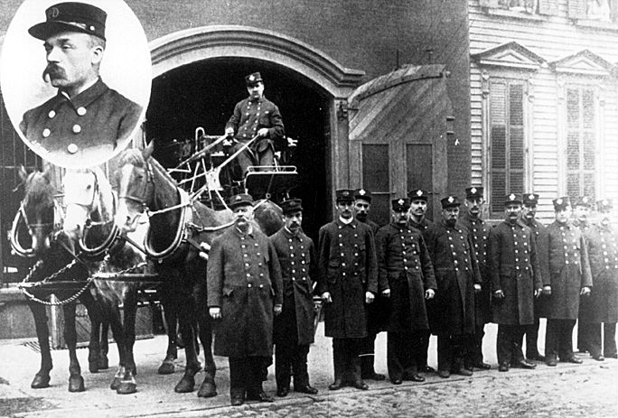 In the foremost rank of life-savers stands Assistant Foreman HENRY WACKERMAN, a man modest and retiring by nature, little given to speaking of incidents in his career as a fireman, but as brave as a lion where duty calls. He was born in this city, Sept. 25, 1860, and lives at No. 312 Maujer Street with his family. On Feb. 3, 1887, he received his appointment to the uniformed force and was assigned to duty with Engine No. 17. He was promoted to the grade of Assistant Foreman and on June 2, 1891, placed second in command of Engine No. 12. Subsequently he as transferred to this company. On the evening of Sept. 21, 1887, a few months after Mr. Wackerman became a member of No. 17, a "still alarm" came in from the corner of Lewis and Lafayette Avenues. When the company reached the scene the fire had worked itself up to the third story and had cut all all means of escape for the Nolan family which occupied the top floor. The family consisted of Mr. Nolan, his wife and four children, and they were at the windows imploring piteously for some one to save them. Mr. Wackerman tried to reach them by the fire-escape at the rear of the house, but the iron ladder burned his hands so badly that he had to give it up. The truck company had not yet reached the fire although an alarm had been sent out, and the only ladder available was a mason's ladder which had been hastily brought from a building in course of erection half a block away by Mr. Wackerman. The ladder was set up on the side of the house nearest to the kitchen and dining-room windows where the Nolan family were gathered, but would not reach within five feet of the window-sill on that floor. The smoke was pouring out of the windows on the lower floors in such volumes as to almost stifle a person mounting the ladder. Mr. Wackerman threw off his rubber coat and his fire-hat and sprang up the ladder. When he reached the top round, he shouted to Mr. Nolan to pass out he children one at a time. The brace fireman stood on the top round with his face and body pressed against the building and without a single thing to save him from falling backward, but he assured Mrs. Nolan that it was perfectly safe to pass the children out to him. It was a perilous undertaking, but when the first child was passed out he took a firm hold of its clothing with his teeth and swung the little one up on his shoulder, and then after getting carefully down on round slid the rest of the way down the ladder. In this way all the children were brought down safely, but when it came to getting Mrs. Nolan out, Fireman Wackerman, who was becoming exhausted, realized the fact that only by the utmost coolness on the part of the woman and himself could they ever reach the ground alive. Mr. Nolan, taking a firm hold of his wife's hands, lowered her carefully over the window-sill. "Talk to her and keep her looking up," shouted the brave man to Mr. Nolan, and the direction was carried out to the letter. Had not Mrs. Nolan been a brave woman both she and her rescuer would have been dashed to pieces on the ground, but she obeyed every direction given her until the courageous man had secured her firmly with one arm and taken the first step downward to a position where he could get a firm hold on the ladder with his unoccupied hand. When he had gained the ground in safety, both the rescued and the rescuer were received with cheers. Mr. Wackerman ascended the ladder again to rescue Mr. Nolan, but in the meantime other engine and truck companies had arrived and Mr. Nolan had been taken out by a front window. As he was descending the ladder, congratulating himself that his perilous work was over, the crowd in the street began to shout, "There's a girl on the second floor, go in and get her." Fireman Wackerman swung himself from the ladder and got into the second-story window. The fire was burning fiercely in the rear of the apartments and the smoke almost overcame him. He groped about until he came to a bedroom, but before he could reach the bed he was obliged to go to a window for air. Then he called for a lantern and groped his way back until he found the bed, but there was no one in it. He held the lantern close to the floor and discovered a man of large build with his head and arms jammed in the narrow space between the lower part of the bed and the floor. He was wedged in so tightly that Mr. Wackermanhad great difficulty in getting him out. The next difficulty was to get the man, who was very heavy, to the window. This was only accomplished by lifting him along a foot at a time. It was an arduous task, and before it was accomplished, Mr. Wackerman was scorched and so overcome by the smoke that when he was taken to the engine-house, his chances of recovery for a time were exceedingly doubtful. The man for whom he had taken the great risk was an invalid, who had been unable to more than roll from his bed and try to crawl under it when he was overcome by the smoke. When taken out into the street life was extinct. Mr. Wackerman had an experience at the Havemeyer sugar house fire on Sept. 7, 1889. Two of the sugar house men were standing on a gravel roof in the rear of the burning building holding the immense pipe of the fireboat "Seth Low". The pipe got the best of the men, and, owing to the immense pressure of water being forced through it, began to dance at a furious rate about the roof, throwing the gravel like hot shot in every direction. Several men tried to get hold of it before it caused serious damage, but were unable to cope with the great nozzle which was tearing up the roof at a lively rate. Mr. Wackerman made up his mind to take a chance with it,and watching his opportunity flung himself full length on the hose and grasped the pipe with both hands. The thing seemed to gain renewed strength when it found there was an effort being made to capture it. It jumped about so viciously that before Stephen Allen, now Foreman of Truck No. 6, and two other men could get to Wackerman's assistanc