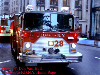 Subject: Thank You Date: Fri, 20 Nov 1998 14:03:35 EST From: COCO28109@aol.com To: Don Van HoltI am a member of the N.Y.C. Fire Department assisgned to Engine company 28, and I wanted to thank you for all the work you have done involving the web site. Just another example of why I am so proud to be a N.Y.C. Firefighter. The younger members have an obligation to uphold the tradition and reputation of this department that members like yourself earned. Thank You.