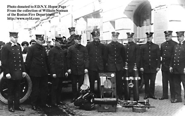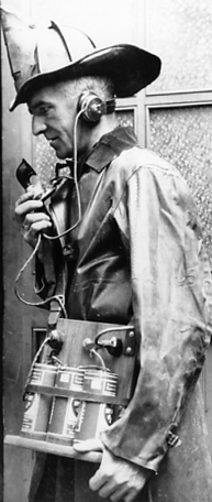 Lt. Thomas Kilbride 1920's using the New FDNY Draeger smoke helmet telephone system.